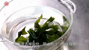 盐泽海带2两,水开后倒入海带节煮2分钟,2分钟后捞出,倒入清水中泡10分钟,清洗干净,作用是去掉盐份,防止有沙;