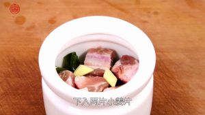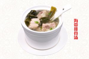 发胀海带,发好的海带12个(2两),依次放入大号的汤杯中,用筷子扒平;再依次下入排骨7块(1两4~1两6),再用筷子扒平,下入两片小姜片,取一量杯,倒入220毫升清水,将220毫升清水全部加入汤杯中,加入盐3克;