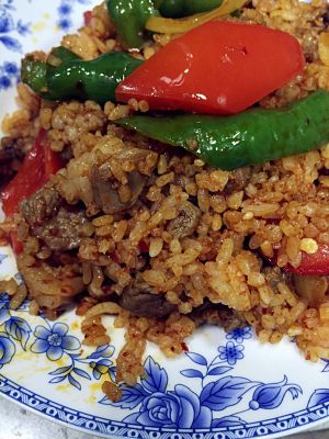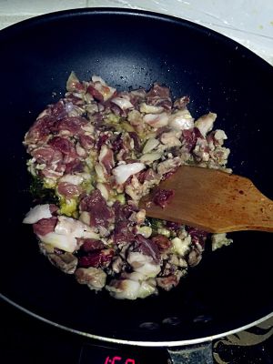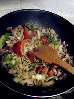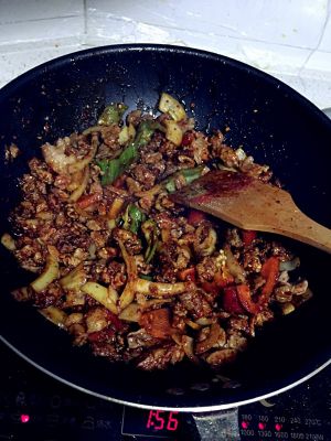 翻炒出香后加入盐,辣椒面,孜然面,混合调料。用量比平时炒菜多一倍(后面需要加米饭)