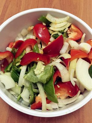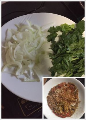 将洋葱切条,香菜切段,用孜然粉,花椒粉,咖喱粉,辣椒粉,糖,调好配料备用