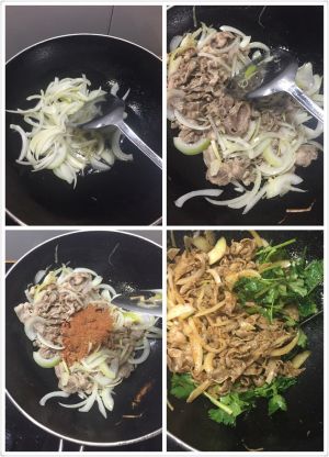 锅内放入底油,烧热,放入洋葱,炒香,倒入焯好的羊肉,撒入料酒,将调好的粉料倒入,再放入一些盐和味素,炒匀,最后将香菜和孜然放入,炒匀即可!