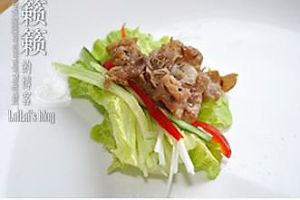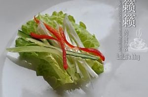 将红甜椒丝、黄瓜丝及葱白丝用少许盐少许糖稍加腌渍,铺在生菜叶杯上,