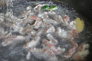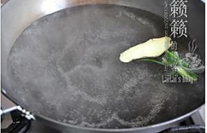 锅内注入清水,加入葱结、姜片,大火煮开后淋入1茶匙料酒,
