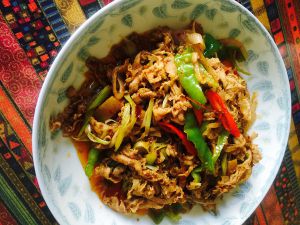 一直炒到没有水、肉香已经出来了,放青椒丝,少量鸡精,多多放孜然、关火