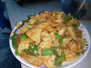 放辣椒胡萝卜,再放提前炸好的肉段,再放调好的料汁(生抽老抽蚝油白醋糖香油)和水淀粉
