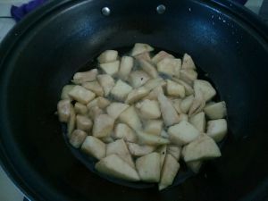 锅里多倒些菜籽油,小心翼翼下茄块炸一会儿。