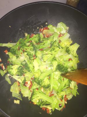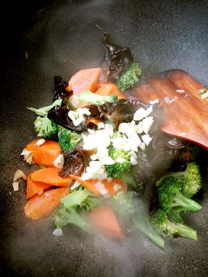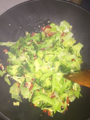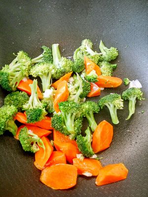 放入西蓝花和断生的胡萝卜,加盐,糖,少许高汤或者水翻炒