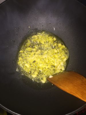 锅里加油,油热后加入蒜沫和姜沫爆香。