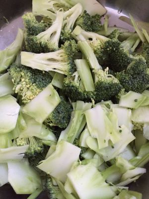 西蓝花掰成小朵,焯水后冷水拔凉待用。