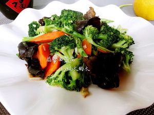 加入木耳,西蓝花,贝丁,加入蚝油,生抽,盐,蒜末,水淀粉勾芡。加入鸡精。