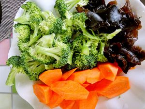 西蓝花掰开成块,胡萝卜去皮切滚刀块,木耳泡发,洗净撕开