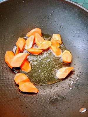 热锅凉油,葱花姜片胡萝卜片爆香。