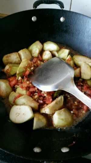 放入茄子,煸炒至茄子变软,放入调好的汁