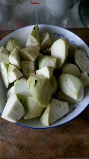 把茄子洗干净切成你自己想切的形状都可以,葱子切成葱花,姜切成末,辣椒切成粒。