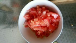 西红柿切碎丁。如果用番茄酱,就省了这步