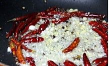 大蒜干辣椒爆锅,加入配料炒至熟透,调汤汁,最后用土豆粉勾芡,加盐味精芝麻即可出锅