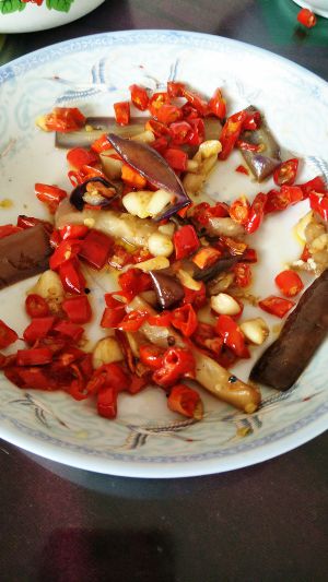 油锅里放适量油,(个人建议不要放太多油)油微热的时候放入盐,然后把茄子沥干水倒进锅里翻炒,至熟然后盛出备用 ③锅里放少许油,放入切好的蒜和辣椒,翻炒,放少许盐,后放入炒好的茄子,翻炒,到入少许酱油(生抽),即可出锅