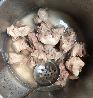 排骨冷水下锅,放几段葱,少许料酒,煮2.3分钟,然后捞出来过凉水,冲洗一下