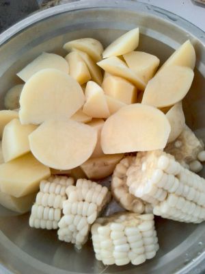 把玉米切块,土豆滚刀后,用开水焯一下,用凉水冲洗备用!