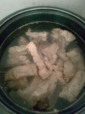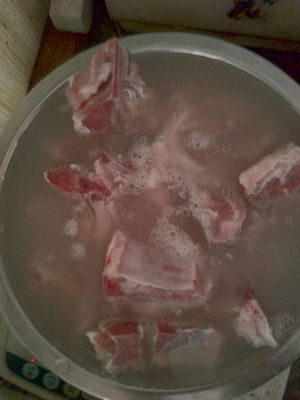 排骨先焯一下,直到看不见血色,把排骨洗净放入锅里煮,煮滚烫后,把排骨捞出来,水倒掉,排骨再冲洗下,备用。