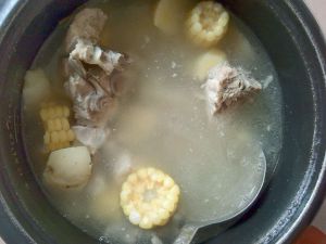 汤锅中的排骨汤煮成乳白色,将胡萝卜,玉米,番茄一起加入排骨汤中,用小火熬40分钟,把胡萝卜和排骨熬烂,加入少许鸡精和胡椒即可!