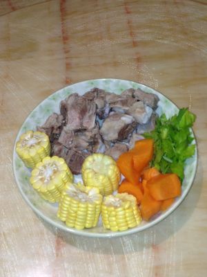 把排骨切成块,玉米,胡萝卜,切块,芹菜切丁。