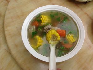 熬好后放入食用盐,适量鸡精,也可省略掉不下,撒入芹菜,即可享受美味的胡萝卜玉米排骨汤。