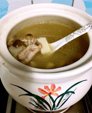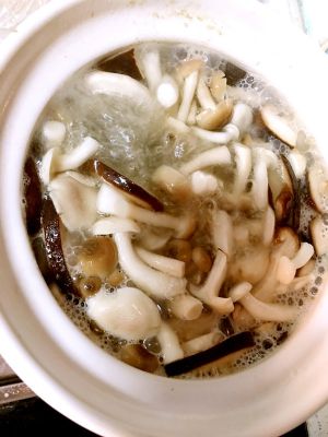待砂锅水开后,加入排骨和蘑菇,大火煮开后转小火炖30分钟