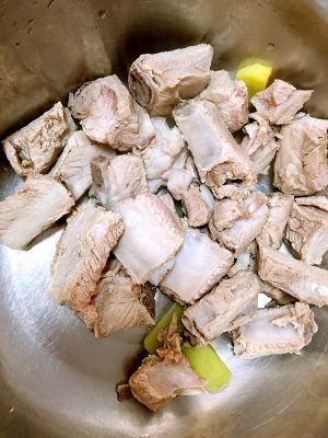 冷水入锅,放入姜片,焯水去腥。水开后3分钟可捞出,水不留。