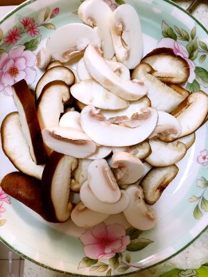 各色蘑菇切厚片,同时砂锅加凉水、葱段、姜片烧开