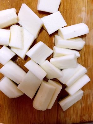 藕和芋头分别洗净,去皮,切滚刀块,入锅喽~先撒点薄盐就可以去睡觉觉啦~ 等着明早开锅,小小装饰后就可以喝咯,这种便利和安全性,大概就是电饭锅比砂锅的优势啦~