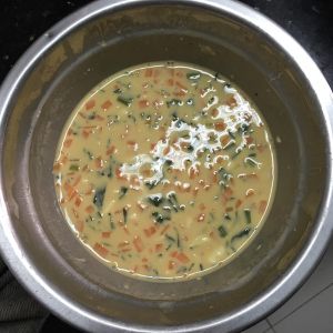 3、把蒸好的蔬菜鳕鱼肠放凉后倒进蛋浆里搅拌均匀。
