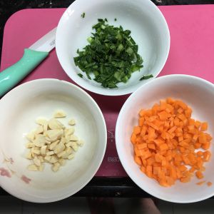 葱切葱花,嫩南瓜(有些地方叫西葫芦)胡罗卜切丝,因为宝宝小切丝后又切了一刀,方便她咬断!