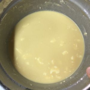 2、鸡蛋,面粉加点水,一起搅拌糊开。不能有颗粒,然后把芝士粒切小块放进去搅拌。
