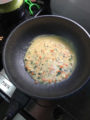 4、热锅,加点橄榄油,勺蛋浆画圆放进锅里,小火慢煎。