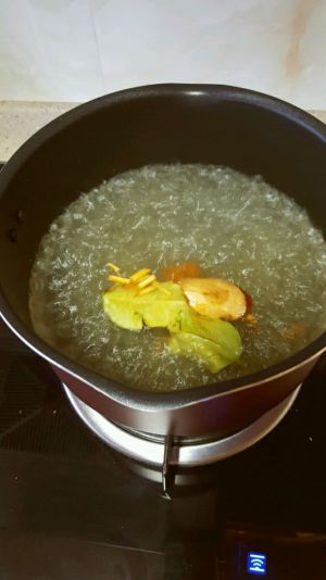 取水烧开,加入柠檬草,香茅以及姜片让其出味;滤出姜片等留取汤汁备用;