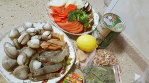 食材准备好.去年泰国带回来的酸辣汤粉一直放在那没有消耗掉.(做冬阴功汤难买的材料.这个泰国酸辣汤粉里面都包含掉了.酸辣汤粉里面成分有山姜.香茅.苦橙叶.香葱头.小辣椒..柠檬酸.柠檬..盐.糖) 今天就做一道冬阴功汤.把活虾清洗干净.新鲜淡菜用刷子刷干净外壳..海鲜菇和番茄也清洗干净.切半个柠檬.香菜洗净备用.