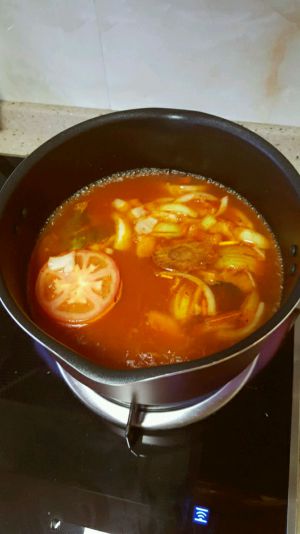 在锅中倒入960ml矿泉水,将刚炒好的虾头放入一半,放入调料包,加入切好的西红柿,冬阴功酱煮5分钟,加入虾,蛤蜊,草菇。自己爱吃的食材都可以加。煮15分钟,倒入椰浆。将柠檬汁适量挤入。