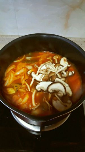 加热汤汁,加入鱿鱼圈待煮半软时依次加入香菇,对虾以及蛤蜊;