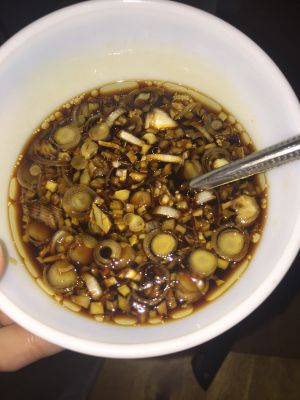 料汁:生抽和醋的比例是一比一,不喜欢酸的可以少放,加上葱花、姜末、麻油,也可以加入适量白糖一起。