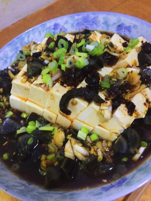 皮蛋切小块摆盘,浇上汁,最后加上辣豆豉撒上葱花点缀即可。