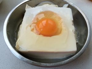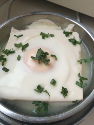 第一步:把一块嫩豆腐中间挖个坑,打个鸡蛋进去;