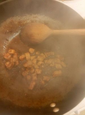 梅肉切成肉末,锅内放油,开小火放入肉末翻炒到变色加适量生抽,盐,老抽炒匀,加150ml左右的水盖上盖子煮一会,等汤汁稠时差不多了。