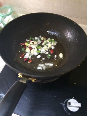 热油,放辣椒,大蒜,爆炒一下
