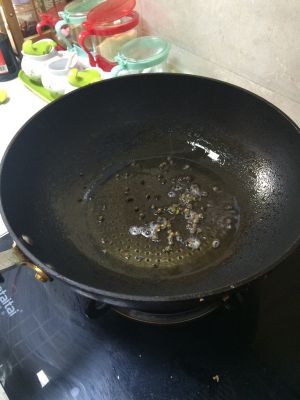 油锅里放入花椒,爆出香味后,捞出花椒扔掉
