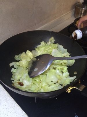 加入包菜,翻炒,倒入生抽,陈醋炒匀,加入盐调味,炒熟即可