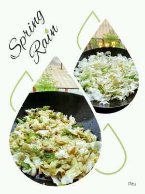 包菜略变色,放蒜葱,继续翻炒。放盐,调味料,出锅前放鸡精
