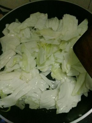 放包菜翻炒 感觉到锅很干的时候 加大概两口的自来水 把菜翻一翻 铺平