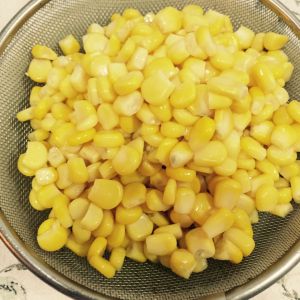 玉米粒洗净,用沸水焯烫一下备用。鲜玉米需煮熟!