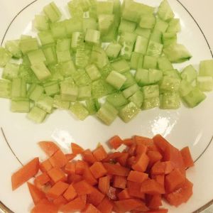 胡萝卜,黄瓜切丁准备 锅烧热,倒入少量花生油,油烧热,放入葱花爆香